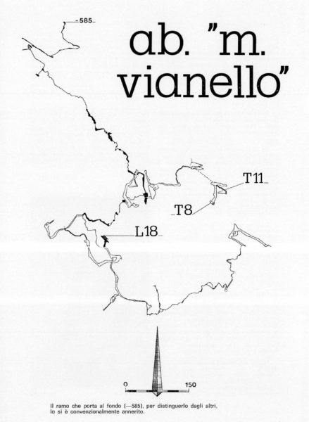 Dopo circa 105 in il soffitto si allarga e si dirama in due cunicoli perpendicolari; infilarsi in quello di destra che porta, dopo 60 m superando l’orifizio di un pozzo cieco di 42 m, in una cavernetta in salita che consente la posizione eretta. Raggiungere uno stretto budello che si apre sul soffitto del punto più alto e percorrerlo per 10 m, fino a nuova posizione eretta.