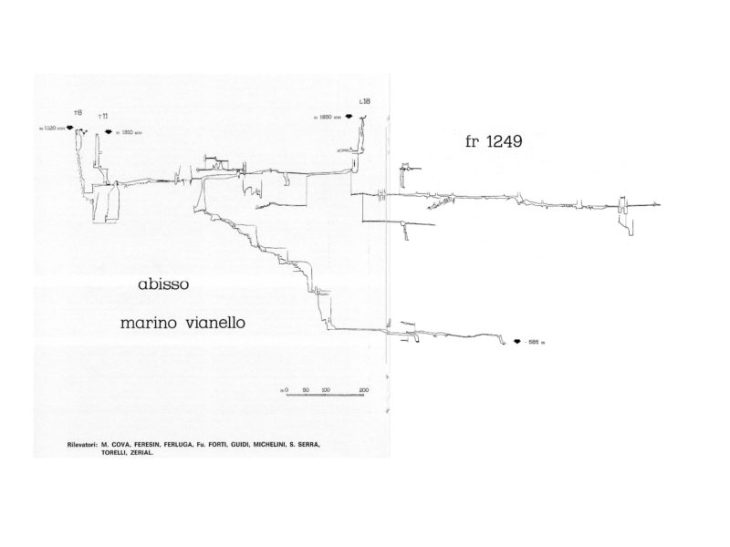 Un tubo di roccia a circa 2,50 m dal fondo, nella parte più bassa della caverna, dà su di un ulteriore meandro; con vari abbassamenti raggiungere il fondo e superare l’ostacolo dei massi crollati in salita e discesa, dopo due brevi salti si giunge ancora sull’orlo di un salto da 23 m (che viene in parte evitato) rimando su lama e attacco su spit, dopo 6 m spostarsi dalla verticale su massi incastrati e discendere ancora 5 m su chiodo a espansione: grandi massi conducono in una caverna parallela nell’apice di una china di pietre (fondo della verticale originaria). Da qui scendere un breve salto e prendere una stretta diaclasi sulla sinistra; al secondo slargo scendere in verticale una stretta fessura, impraticabile nella sua parte superiore, e aggirarla scendendo lo stretto c scomodo «by-pass» che sbocca su tre salti successivi di 3, 6 e 6 m che si risaliranno in arrampicata (25 m di corda, attacco su ponte naturale).
