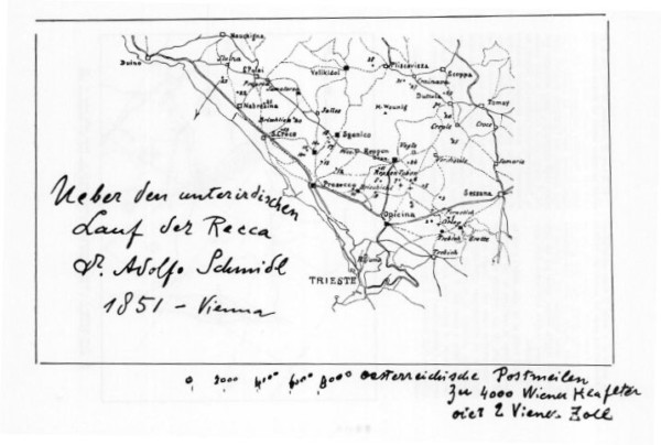 Restando in tema di pratiche ricognitive tradizionali nonchè romantiche, mi piace presentare qui una cartina preziosa risalente al 1851, che ha l’ulteriore pregio di essere stata ricopiata dalla mano di Eugenio Boegan dall’introvabile lavoro di Adolf Schmidl «Ober den unterrirdischen Lauf der Recca». Essa indica le 31 protocavità trovate dall’inventore della speleologia ingaggiato allo scopo dall’i.r. Ministero del Commercio di un paese ordinato, nonchè alcuni punti dove uscivano correnti d’aria con le piene timaviche.