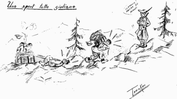 Alla violenza della bora, pur di non rinunciare all’esplorazione, è stato fatto fronte con vero coraggio: è stato tolto il telone all’autocarro, per presentare al vento una minor presa. Va da sé che ci guadagnavano le osterie lungo il percorso con l’erogazione dell’immancabile bicchierino di grappa.