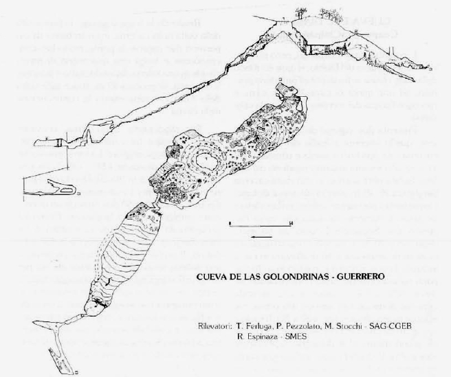 Purtroppo la grotta terminerà con la galle­ria fangosa situata oltre il lago e raggiunta con una difficile arrampicata. Poco male: 406 m di sviluppo e 106 di profondità, ma soprattutto una grotta stupenda, senz’altro la più bella tra quelle da noi scoperte qui in Messico e quella che ci ha regalato l’esplorazione più entusia­smante, destinata a rimanere «dentro» a lungo o per sempre, come ben sanno tutti quelli che nella loro carriera di «grottisti» si son trovati almeno una volta in una situazione analoga.