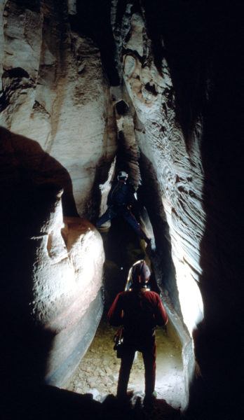 Il meandro conduce su di un grande canyon in cui si ritrova il collettore principale. Il canyon è largo mediamente cinque-sei metri ed alto una trentina. La portata, durante le nostra esplorazione, era di circa trenta litri al secondo, ma evidenti erano i segni lasciati dalle piene a circa dieci metri di altezza sulle pareti. che davano una immagine eloquente sui volumi d’acqua che percorrono queste zone durante la stagione delle piogge. Il canyon è percorribile sia verso monte, per circa 120 metri sino ad un punto stretto forse superabile con una arrampicata. che verso valle dove, dopo una cinquantina di metri, svolta bruscamente verso E, restringendosi sensibilmente ma mantenendo uguale altezza.