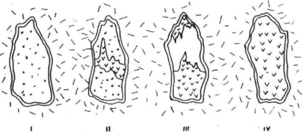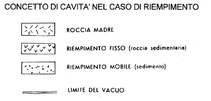 Va anche ricordato che la successione temporale di tutti i vari tipi di depositi di riempimento non è sempre ben chiara. Vi possono coesistere anche delle fasi alterne di deposito e di successivo svuotamento, più volte ripetute. Tutto ciò può essere anche avvenuto in un momento carsico di gran lunga posteriore alla fase genetica della cavità ed i vari depositi e le loro fasi possono semplicemente costituire i momenti di maturazione e di senilità dell’evento “grotta”. Gli schizzi I. e II, illustrano il tipo a), riempimento completo; lo schizzo III. mostra che in caso di parziale riempimento con materiale cementato, il termine vacuo viene interpretato nel senso più estensivo. Dalla successione degli schizzi risulta logicamente che il termine grotta è da usare anche per il tipo b), IV. schizzo (riempimento completo). (da Trimmel. Rassegna Speleologica Italiana, 1963)