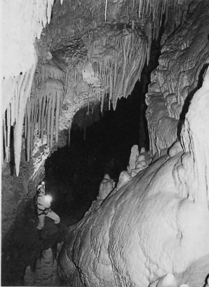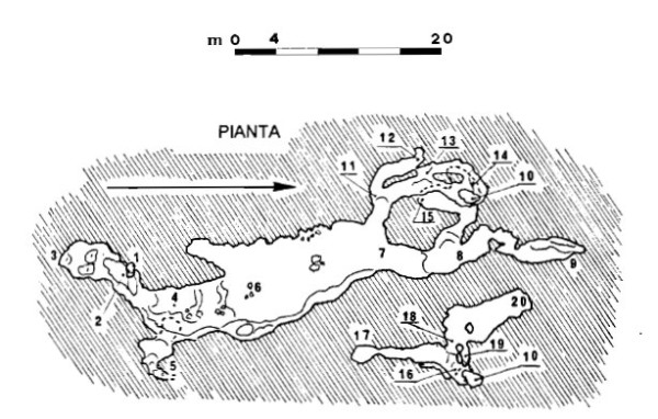 Il pozzo d’accesso inizialmente si presenta angusto ed inclinato. Dopo 5 metri si allarga e superati due ripiani ed un salto nel vuoto di m 5 si giunge in un punto di suddivisione verso sud il pozzo prosegue per altri 7 metri terminando con un vano occupato in parte da grossi blocchi incastrati verso Nord una galleria in discesa immette in una caverna di m 8×20, molto ben concrezionata e dal suolo pianeggiante. II lato ovest della caverna e particolarrnente suggestivo, essendo in parte costituito da un organo con delle canne molto alte. Nel mezzo il soffitto e traforato da due carnini che probabilmente giungono quasi fino all’esterno. Sul lato Nord la grotta prosegue con due rami apparentemente distinti e che invece presentano poi ancora un punto di collegamento. Verso destra si sale per dei corridoi suddivisi da un salto e da due strettoie tra una foresta di colonne e stalagmiti, verso sinistra, superato un cunicolo ed una serie di pozzetti, si giunge in un’ultirna saletta scintillante, lunga m 7 e dal suolo argilloso.