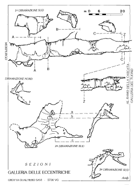 Delle quattro gallerie citate la più evidente, che si nota subito a destra all’uscita del ‘Calvario”, è quella delle “Eccentriche” il cui portale d’ingresso e diviso in due da un imponente torrione strapiombante, la cui sommità tocca quasi la volta. La soglia del portale è pensile e molto prossima alla fatidica Q. 350 m che ritroveremo ricorrente nella successiva galleria, tra le più entusiasmanti e ricche di concrezioni (da cui il nome) di tutto l’intero complesso.