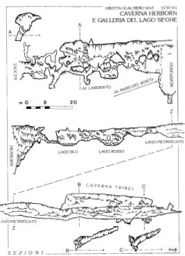 Proseguendo idealmente lungo la parete pressoché verticale e priva di concrezioni, si scende fino al punto più basso della caverna dove l’effetto di drenaggio è evidenziato dalla presenza di deposito di materiali minuti, come sabbie ed argille anche di recente sedimentazione. In questa zona povera di concrezioni, esattamente al centro della forra in cui si chiude la ‘Sala Morpurgo”, si trova una stalagmite di circa 1 m di altezza di calcite bianca che per il suo curioso aspetto è stata denominata “Il Gelato” (servito nei gusti: limone, panna, fiordilatte, cocco). Sulla sua verticale, a una decina di metri d’altezza, un gigantesco masso (la gelateria?) è rimasto incastrato tra le pareti della forra, e da esso si è potuto accedere ed esplorare un camino che si apre sulla parete N, ma senza particolare esito. Poco oltre il Gelato, sulla parete S, l’esplorazione di un altro camino con due diramazioni ha dato risultati purtroppo analoghi. La forra che si origina dalla “Sala Morpurgo” in corrispondenza del “Gelato” con la direzione WNW è il risultato di una frattura subverticale il cui fondo è piuttosto tormentato per la presenza di notevole materiale di crollo; vi si trovano anche insoliti depositi di argille gialle e, verso la metà, un pozzo di circa 5 metri in materiale incoerente costituisce il punto di assorbimento di questo tratto della grotta. Lo si evita passando sul bordo, quindi dopo pochi metri le pareti verticali e i grossi massi cementati strapiombanti si possono agevolmente superare con l’uso di una scala fissa. Scala, la cui posa si sarebbe potuta evitare se i “Grottenarbeiter” non si fossero fatti prendere dalla pigrizia e avessero scavato un bel tunnel orizzontale di 2×1 x 20 metri per sbucare direttamente sul fondo della “Sala Herborn”.