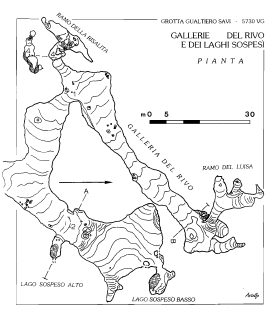 Dopo 7 metri esso sbocca all’improvviso in una terza sala ad un’altezza di m 4. Percorrendo questo cunicolo si ha quasi la sensazione di oltrepassare un’immane deposito di argilla e calcite venuto a formarsi tra le due sale. Si prosegue quindi in comoda discesa in una caverna con un’altezza di m 1 ed una larghezza di m 9 (Galleria dei Laghi Sospesi, pagina 18).