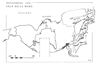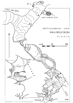 In particolare il secondo pozzo, nel tratto inferiore, viene a costituire un’ampia sala (Sala delle Mura) che presenta nella parte inferiore un caratteristico portale largo m 4 ed alto 2,5 che immette in una seconda sala ascendente. Per accedere ad essa e necessario superare una specie di catino molto fangoso che in periodi piovosi parzialmente si allaga formando un laghetto. Si sale quindi una ripida china di m 15 e superata una paretina ci si infila in un budello fangoso, inizialmente basso e stretto, poi sempre basso ma un po’ più largo.