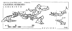 Come già detto il ciclopico ammasso calcificato che culmina con la Cresta Concrezionata è bizzarramente traforato da un dedalo di cunicoli nel quale si è riusciti a ricavare un percorso in direzione NW che permette di raggiungere il centro della “Her born” quasi sul fondo. Questo, osservato dalla sommità della Cresta Concrezionata, appare come una civettuola spiaggetta della Costa Amalfitana, racchiusa tra ripide pareti. Purtroppo mancano due accessori importanti, sole e mare. Da qui dirigendosi verso NE, si arriva ad un piccolo pozzo che si apre tra i blocchi di frana e da cui si accede facilmente ad una breve ma interessante diramazione il “Labirinto” che si sviluppa lungo la frattura principale e la cui esplorazione potrebbe essere continuata con qualche gratificante scoperta. I recenti rilievi eseguiti in questa diramazione hanno evidenziato la particolarità di questo piccolo sistema che con un po’ di immodestia si potrebbe definire come “la grotta nella grotta”.