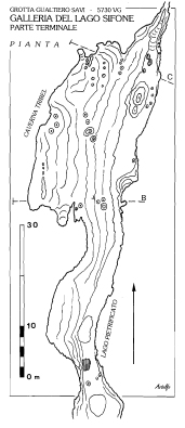 Poco prima sulla destra, a qualche metro dal fondo, in una cavernetta si estende un laghetto circondato da concrezioni scintillanti. Per proseguire è bene tenersi sulla sinistra onde evitare un tratto più ripido e dopo 18 metri si giunge nel punto più basso di questa sala. Qui volta e pavimento si avvicinano notevolmente dando origine ad una larga “buca da lettere”, forzata dopo robusti scavi ma che purtroppo chiude con uno stretto camino. Sul lato opposto la caverna presenta ancora un tratto ascendente concrezionato con alla fine un’ultima cavernetta con un secondo laghetto.