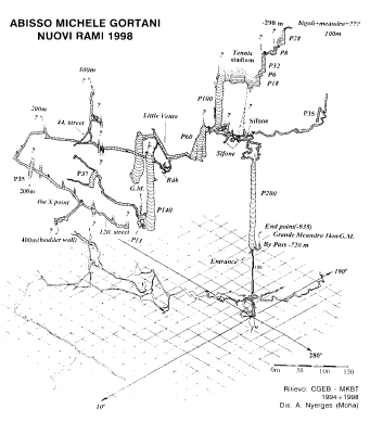 Sopra la risalita, più di 200 m di meandri e condottine portano ad un pozzo di 60 m sotto il quale prosegue una galleria, che ben presto diventa una scomodissima condottina, spazzata però da un vento micidiale: arrivati ad un bivio ci affacciamo da un parte su un pozzo di circa 150 metri e dall’altra su un’altra verti cale valutata un centinaio di metri. Ci rendiamo conto che siamo capitati in qualcosa di molto serio e che il lavoro esplorativo sarà enorme; data la quantità di ore che ci separa dall’ingresso (circa otto) decidiamo per le prossime volte di adottare la tecnica ungherese, organizzandoci con punte prolungate di diversi giorni. Infatti con l’esplorazione successiva incomincia l’era delle settimane bianche, cioè dei campi interni di una settimana: se ne organizzano uno a fine estate ’97 e l’altro nell’agosto ’98. Il problema logistico di questa tecnica è che la squadra interna deve essere sempre in contatto con l’esterno in modo da essere sempre aggiornata sulle condizioni meteorologiche e poter esplorare così in totale sicurezza, senza il rischio di piene improvvise. Questo implica una linea telefonica dall’esterno fino al campo che, chiaramente, deve essere in un posto sicuro, e qualcuno all’esterno che aggiorni periodicamente la squadra in punta.