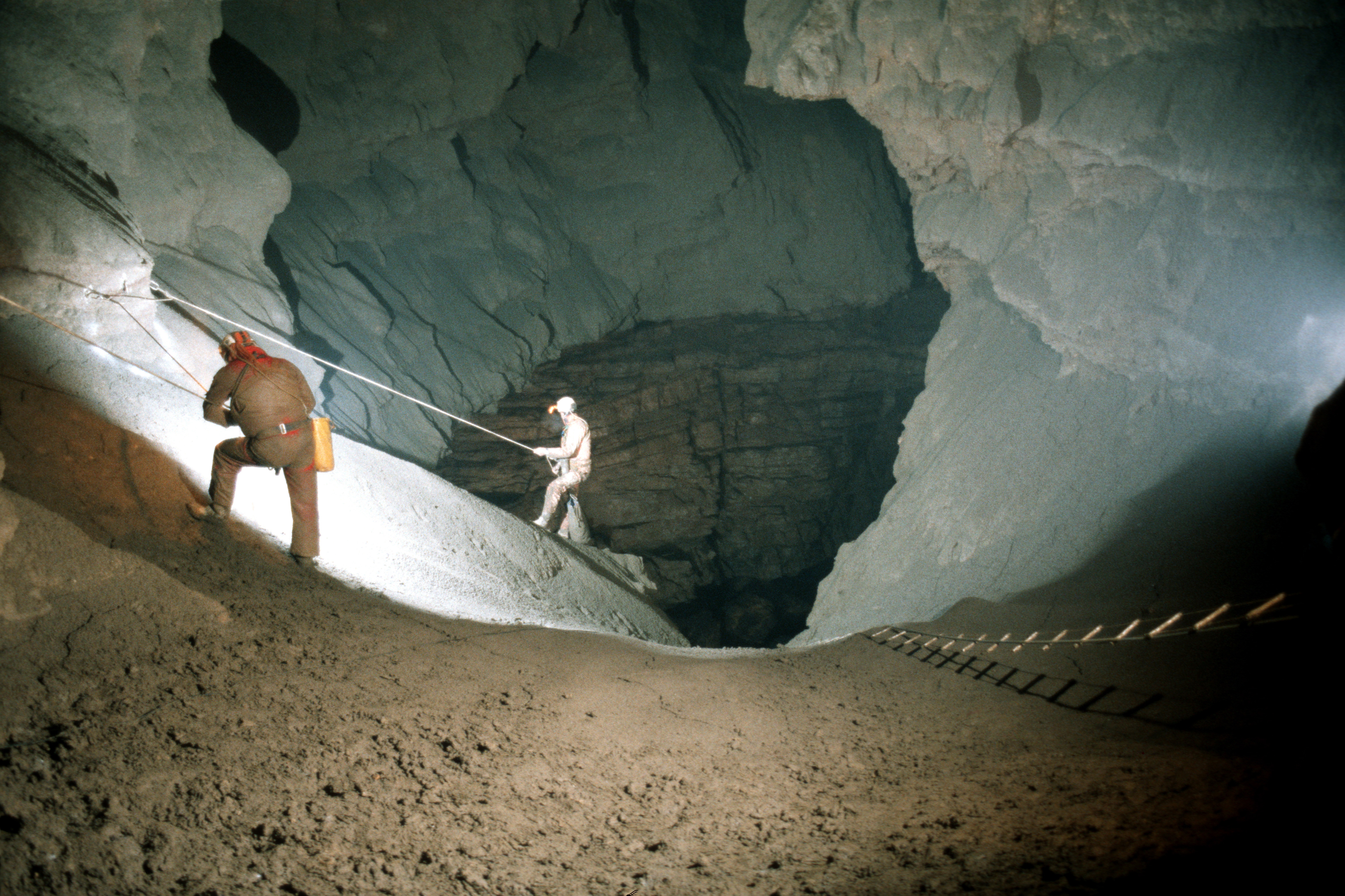 Finalmente, a novanta metri di profondità, la frana si è esaurita. Davanti a noi, allora, si stagliarono lame di dissoluzione incombenti su pozzi strettissimi ed intensamente erosi. Dato che non era più necessario puntellare pareti e massi, i lavori di ampliamento strettoie proseguirono abbastanza spediti: il materiale detritico continuava ad essere issato nella “Caverna della Salvezza”, si mettevano in opera le scale metalliche fisse e si proseguiva lo stendimento della linea elettrica.