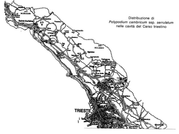 Sul Carso triestino Polypodium cam-bricum ssp. serrulatum è stato sinora individuato in 13 cavità, rappresentate nella sottostante