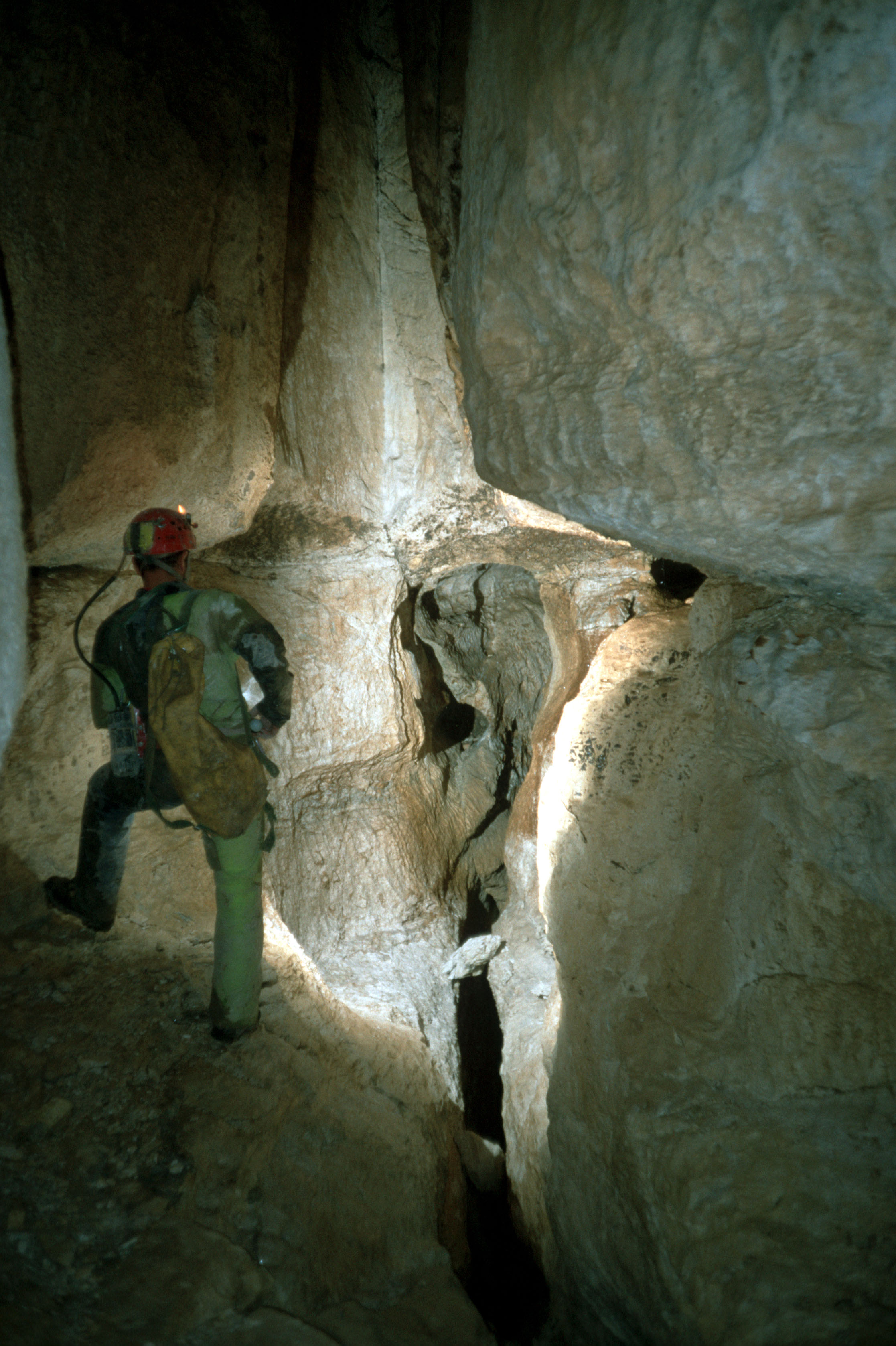 Dopo aver oltrepassato un pozzo dasessanta metri, con modeste scariche di adrenalina, arriviamo ad uno slargo, ed iniziano le “rogne”. Quattrocento metri di meandro, praticamente in salita, con innalzamenti e sporadiche risalite in corda.