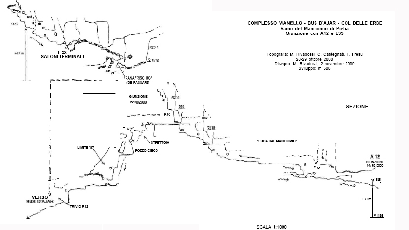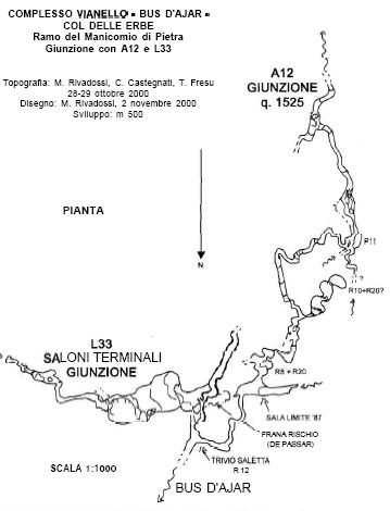 Qui, tempo addietro si erano fermati Fox, Pacia e Beccuccio, probabilmente colti da esaurimento nervoso!! Superati ancora cento metri di tormento, oltrepassiamo il limite massimo raggiunto nel lontano ‘87. Qui i bresciani hanno continuato a risalire il meandro principale, forzando ogni tanto qualche strettoia. Finalmente siamo ai livelli superiori del complesso, perdiamo ben presto gli ambienti stretti e le basse condotte freatiche. Le risalite ci fanno guadagnare velocemente la quota dei 1500, quella della giunzione. Arriviamo in un meandro largo, sotto ad un arrivo promettente (sarà de tornar, ma quando?). Intuiamo dalle tracce di essere in zone note e poco più avanti si è nel meandro principale della A12 e dopo quaranta metri sul pozzo da “54”, che ci collega al Ramo dei Bigoli con Marmitte del Gortani, in zona Meandro de Plucia. Per capire dove siamo arrivati, risaliamo venti metri e troviamo dei capisaldi di rilievo, con scritte in spray rosso. Ormai non ci resta che tornare indietro e rilevare il tratto appena esplorato (sigh, solo settanta battute! !).