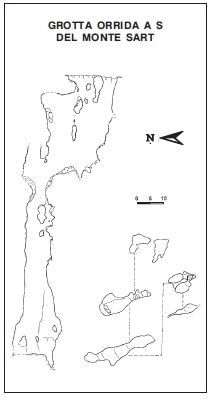 Delle diverse cavità esplorate abbastanza di recente nella zona a S del Monte Sart vengono qui descritte tre che presentano un certo interesse esplorativo. Tutte sono raggiungibili lasciando la mulattiera Forca di Terra Rossa – bivacco Crasso in prossimità dell’Abisso delle Pozze e scendendo verso S per ripide paretine intervallate da brevi ripiani, in circa un’ora di cammino dal bivacco Marussich.