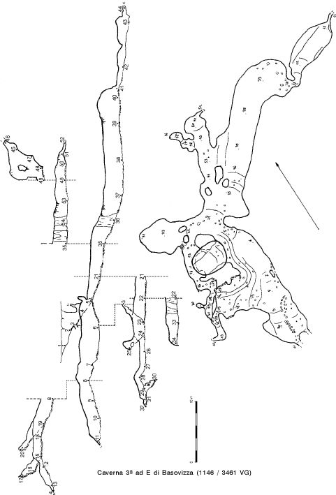 Dati catastali: VG 3461/ RG 1146 Caverna 3° ad E di Basovizza, CTR 1:5000 Basovizza 13°52’08”4 – 45°38’36”6, quota ingresso m 383, sviluppo m 158, profondità m 11, rilievi precedenti Marini – Sironich 9-9-1967, rilievo attuale Mikolic 25-2-2005.