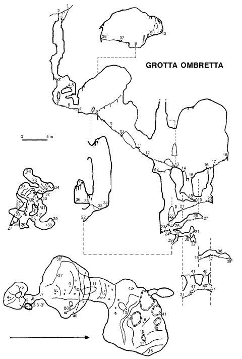 VG 4238/ 1298 Grotta Ombretta, CTR 1:5000 Rupinpiccolo 110064, posizione 13°46’30”0 – 45°44’14”3, quota ingresso m 372, sviluppo planimetrico m 90, profondità m 45, pozzo accesso m 17,8, pozzi interni m 12/ 4/ 6,3, rilevatori: Umberto Mikolic – Franco Florit 27-11-2004.