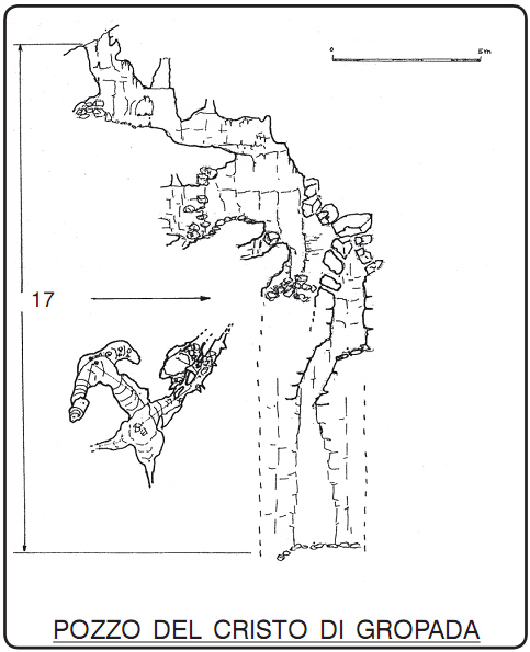 L’attività di scavo si è svolta in una cavità che si apre sul fianco sud-ovest della dolina; questa grotticina era stata aperta e visitata nel 1993 da “F. Premiani & A. Mandich – GSSG” che l’avevano rilevata e chiamata “Pozzo del Cristo di Gropada”, ovviamente, e successivamente catastata con il numero 5812 VG.