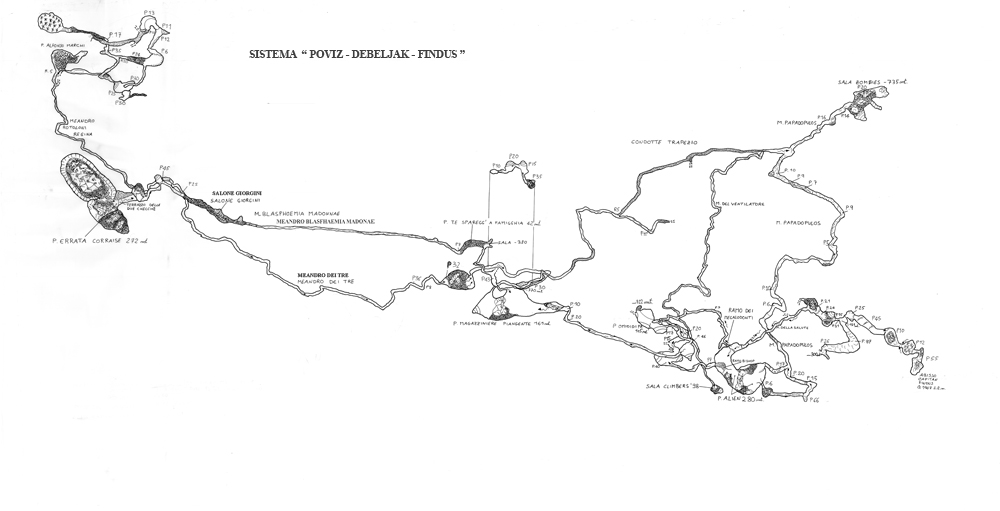 Da una parte l ‘ attivo , che stranamente chiude a – 330 in zone sifonanti ( siamo praticamente alla stessa quota dell ‘ ingresso del Findus ! ) , mentre dall ‘ altra abbiamo il fossile , fermi a – 420 su P 20 con un ‘ ipotetica freccia indicante il fondo valle sloveno … ovvero 1500 mt di potenziale!