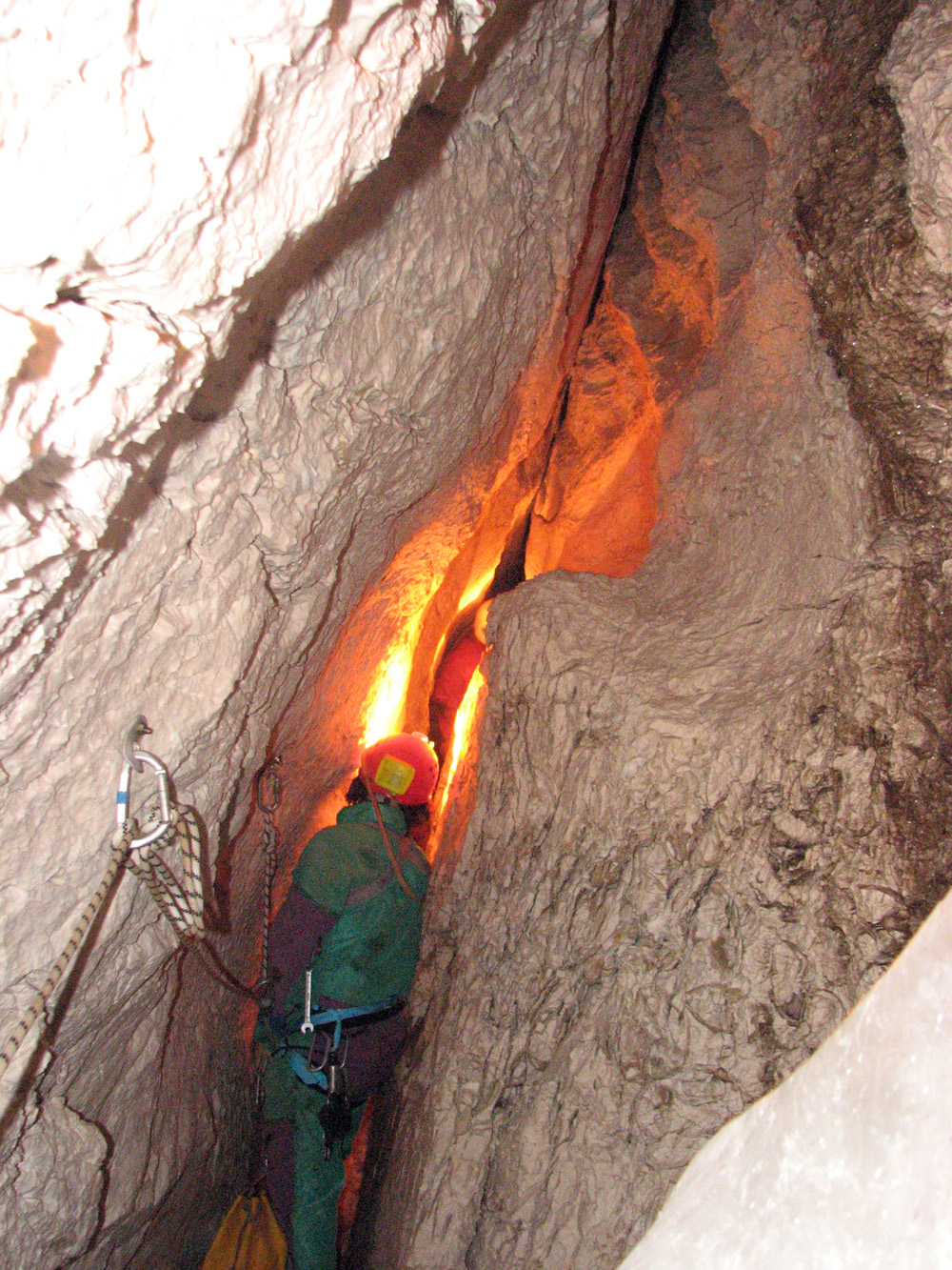 Da notare che da subito la nuova cavità ha occupato le pagine della cronaca locale per via di un collega ungherese che si è procurato una doppia frattura ad una gamba fortunatamente alla modesta quota di – 70 . Adesso aspettiamo l ‘estate 2007 per approfondire la situazione! Il 2006 si conclude con due punte in Pero dove , anche con l ‘aiuto di Gabriele , Giannetti ed il sottoscritto a – 300 troviamo una via alternativa e più veloce per giungere nella sala delle meteore . Grazie ad un audace traverso – dei bulli – conquistiamo la parete opposta del P 140 “ I love my gibbs “ e sulle note dello zoo di 105 ci troviamo , tanto per cambiare , in un meandro a mezza altezza sfociante in un enorme vuoto da 8 secondi ! Gabriele chiama subito caffè , io sono già alla grappa e quindi tocca al caro Gianni combattere il Parkinsons ( leggi popò ) ed armare i 140 mt che portano direttamente nel comodo salotto della Canin per bene.Da qui con l’ausilio di un potente faro scorgiamo 4 finestre molto promettenti e da subito il nostro Gianni , ansioso di aprire nuove vie verso l’ignoto , mi convince a ritornare vestiti da fighetti con tanto di , nut , cliff , scarpette , tutù e paiettes ! E così la volta successiva mi trovo per le mani questa specie di pinza per freni con su scritto gri-gri a far sicura sotto un ‘ incessante pioggia di pietre ! 20 mt, terrazzino altri 20 mt , strettoia e poi Gianni sparisce in libera dentro un camino in frana per giungere sotto l’ennesimo arrivo … Più che by-pass verso il Findus mi sa che siamo finiti in un ‘ imboscata dove le pietre la fanno da padrone !