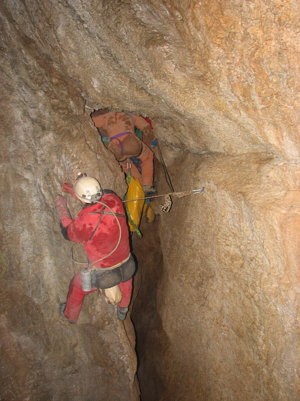 La vendemmia continua e con Giannetti mi ritrovo di nuovo in quel comodissimo meandro – Blasfemia Madonnae – nell ‘ abisso delle Casermette in compagnia di Moha e Leo due speleo ungheresi.Dopo varie battute sull ‘ origine del Tocai gli amici magiari a – 340 battono in ritirata . Come dargli torto ? Non dormono ancora prima della partenza dall ‘ Ungheria , hanno tutta la settimana per acclimatarsi al Palacelar e come inizio sono subito scesi in uno dei più infimi degli abissi ! Per arrivare a – 440 dove c ‘ è il primo collegamento con il Findus ci vogliono 5 ore di progressione per uno sviluppo di soltanto 500 metri ! Infatti ci danno dei “ crazy “ a esplorare in zone simili in due … Ovviamente lo prendiamo come un complimento !