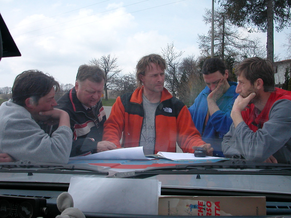 Era Franz di Malchina che quando era a corto di argomenti in tavolate speleologiche che facevano a gara a spararla più grossa, era lui dicevo, che parlava di prosecuzioni sicure in vari buchi, anche se in realtà ne aveva visto solo uno in zona, la Grotta a S di Podleschie (Roupa) ex 1414 VG alcuni anni addietro. A me la zona interessava, sia per averla vista di sfuggita compiendo delle classiche ripetizioni all’Abisso di Verco di Canale (dove nel 1929 la nostra Commissione Grotte fece, anche se per poco tempo e con un rilievo “generoso”, il record mondiale di profondità) e la recente Ponor Polne Lune, splendido inghiottitoio stile messicano trovato ed esplorato nel 1998 dai tipi del DRZLJ di Lubiana. La proposta quindi era allettante, la zona di ricerca sia interna che esterna talmente vasta da far cadere le braccia, una sede logistica era stata trovata (una ex bordello chiaramente..), e avevamo anche chi parlava l’idioma slavo, Alex e Franz, chè nelle bettole dell’altipiano il forestiero non è il benvenuto (soprattutto se “talian” e quindi “fassista”). Vari aneddoti e gag e emozioni ci hanno accompagnato in questi due anni, tra battute di zona ed esplorazioni di pozzi guidati dai contadini locali (uno su tutti: il rusticissimo Boroevic, così soprannominato giacchè ad ogni indizio di battaglia sul terreno durante le uscite assieme a noi, tesseva le lodi del genio militare – questo sì autentico – del C.te delle armata austroungarica del fronte dell’Isonzo.) e vari show serali nella bettola dell’altipiano, la fucina di talenti cabarettistici sotto spirito denominata “Zbogar”.