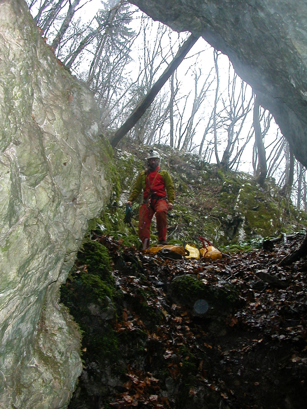 Arrivando ai nostri giorni, è di Franz l’idea di ripetere la cavità e vedere un’arrampicata già iniziata nel 1998 (fatta da alcuni soci del Gruppo Speleo Hermada di Malchina) e mai completata nella saletta che divide i due pozzi principali della grotta. La prima gita termina ben presto in quanto pur avendo con noi il funambolo Giannetti, il trapano portato da Alex non funziona, noi ripieghiamo nel ripetere la cavità sino al fondo di -220 e controllare alcune finestre purtroppo cieche, imponenti in ogni caso i pozzi principali. Durante la risalita, poco prima di uscire, nel grande salone di frana inclinato, una fessura è aperta tra due massi crollati a livello del pavimento, un sasso rotola giù per non meno di 20 metri….possibile che non sia mai stato visto? Confermiamo, il posto non è mai stato indagato. Fin troppo facile quindi la volta successiva, scendo io un pozzo di circa 30 metri in cui si innesta un meandro che diventa troppo presto strettino: noi oramai abbiamo la soluzione a tutto e lo allarghiamo in più punti, sinchè la progressione diventa pozzo, meandrino da aprire, pozzo, meandrino e così via, sino ad una bella verticale di 35 metri che sprofonda più ampia delle altre, pregustiamo gloria e onore dovuti al prossimo, lunghissimo viaggio ipogeo nella Bainsizza. Sceso il pozzo, è la fine di tutto: planiamo nella saletta già scoperta nel 1998 e tanti saluti. In ogni caso ci siamo come sempre divertiti, abbiamo scoperto un nuovo tratto profondo -94 e con 220mt di sviluppo…buta via, ah! La direzione prevalente del nuovo tratto è di 340°, ed è percorso da un piccolo ruscello che in caso di piogge esterne probabilmente fa la voce più grossa, ma niente di cui spaventarsi…ah, ma a chi interessa sta roba? Alla prossima!