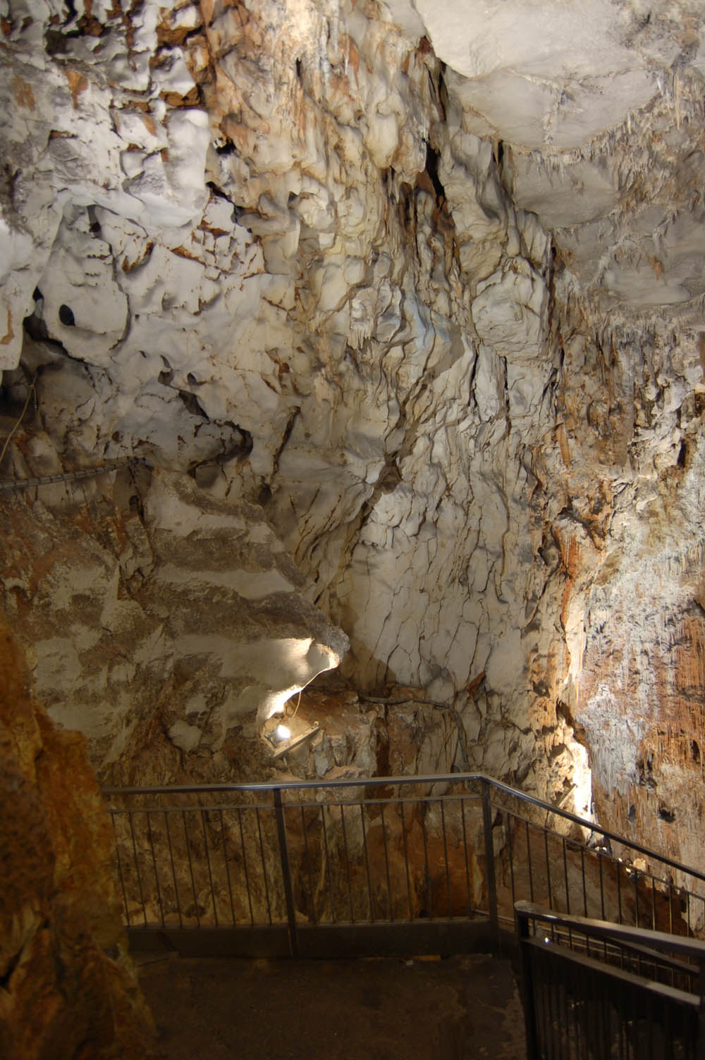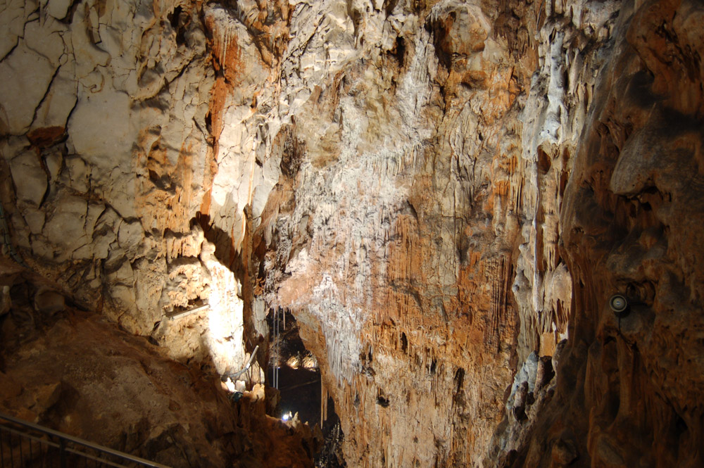 Entrando in Grotta Gigante, subito dopo il cancello interno, appare in tutta la sua maestosità la grande galleria che si sviluppa in direzione S, verso l’ imponente caverna sottostante. Fermiamoci qui e valutiamo con grande attenzione quanto i nostri occhi e la nostra mente possono vedere e capire. La grande parete “di fondo”, quella posta al di sotto del secondo ingresso (non utilizzabile), è completamente ricoperta da una concrezione rossastra, stalattiti comprese, che però è largamente chiazzata da una concrezione biancastra, di più recente deposizione, perché ricoprente quella rossastra. La formazione della calcite “bianca” risulta essere priva di ossidi di ferro, mentre la precedente concrezione risulta essere molto ricca. A questo punto sorge una seria considerazione: La solubilità dell’ossido di ferro nell’acqua si riferisce a periodi climaticamente più caldi dell’attuale e che da analisi compiute da vari studiosi, sembra che il concrezionamento che ha virato sul bianco sia iniziato una decina di migliaia di anni fa, corrispondente quindi esattamente al Periodo Olocenico. Se tutto ciò corrisponde a verità, allora non vi può essere dubbio alcuno che, attualmente, siamo in un periodo più freddo del precedente, che ovviamente non poteva essere altro che il Pleistocene, da tutta la letteratura scientifica altrimenti definito, come caratterizzato invece da svariati “periodi glaciali” e quindi decisamente più freddo! Questa sembra essere una evidente contraddizione, almeno per quanto riguarda il concrezionamento calcitico, non solo per la Grotta Gigante, ma in generale poiché tale fenomeno risulta essere molto generalizzato!