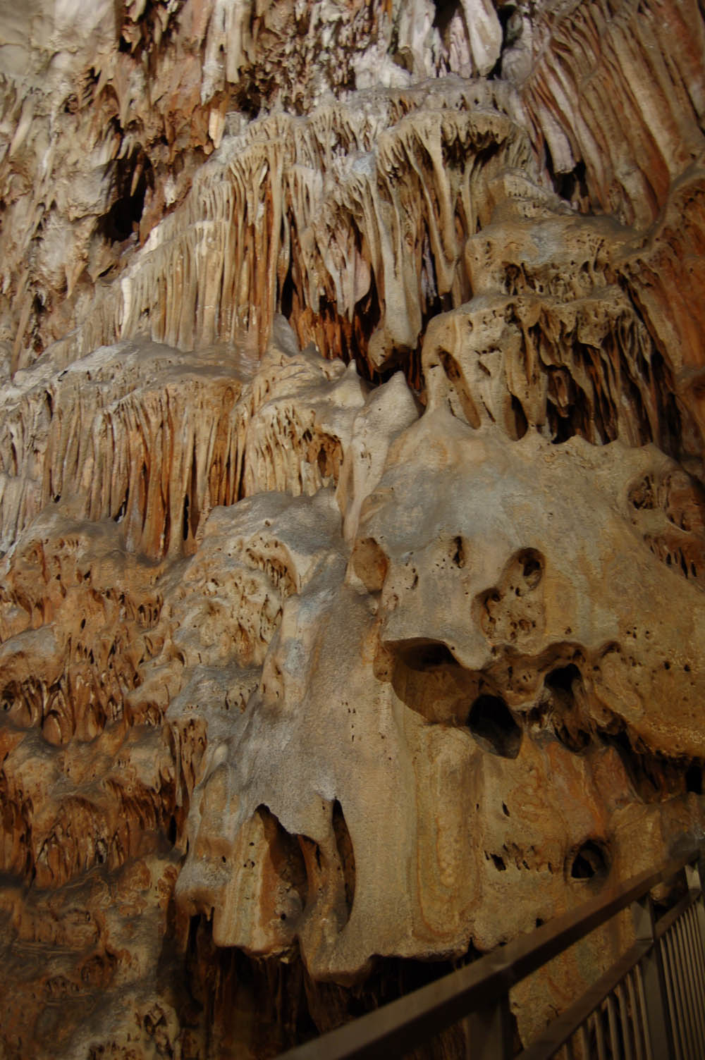 A completamento di questa situazione morfologica illustrante un effetto dissolutivo quasi totale, sulla parete sinistra, volgendo lo sguardo alla parete destra, questa appare ancora riccamente concrezionata da colate calcitiche, stalattiti e stalagmiti, tutte rossastre, però anche queste sono completamente inattive. Qui, da lungo tempo (inizio Olocene), lo stillicidio è ormai quasi assente e quindi il concrezionamento si è praticamente fermato. Ma osservando con maggiore attenzione, tutte le concrezioni mostrano un chiaro segno di una generale diffusa consumazione, con cariature, desquamazioni, assotigliamenti. Sembra che su questa parete il fenomeno dissolutivo da circolazione d’aria sia di minore entità, infatti la corrente d’aria è qui meno intensa rispetto a quella sulla parete di sinistra, ma ciononostante tale fenomeno è palesamente bene riscontrabile.