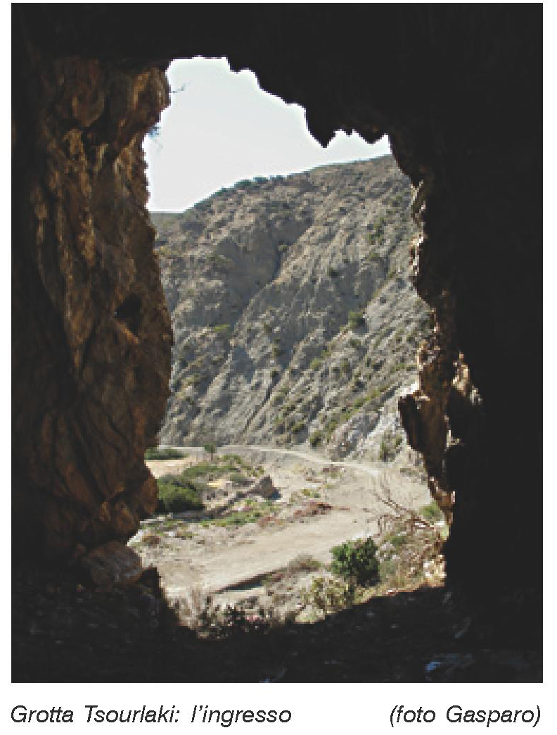 La più estesa cavità dell’isola, che è anche l’unica da me visitata, è la Grotta Tsourlaki (Spilaio Tsourlaki) o Grotta dei Pipistrelli (Fledermaushöhle), che si apre a 70 metri s.l.m. sul versante sinistro di una piccola valle, poco a monte di un’area militare, non lontano dalla strada Pigadia-Aperi. È formata da una spaziosa caverna iniziale a pianta rettangolare, lunga una trentina di metri, saltuariamente utilizzata come ricovero per le capre. Dalla caverna, priva di concrezioni ed interessata da crolli, si dipartono tre gallerie costituite da strette fessure verticali, che portano lo sviluppo complessivo dei vani ipogei a poco più di 100 metri. Le ricerche faunistiche hanno evidenziato la presenza di elementi banali, che si rinvengono con una certa frequenza nei tratti iniziali delle grotte mediterranee di bassa quota, calde e con umidità del suolo non elevata. Si tratta dei ragni Loxosceles rufescens (Dufour), Scytodes thoracica (Latreille) e Uloborus plumipes Lucas, dell’opilione Leiobunum sp. (esemplare giovane, det. Novak) e dello scorpione Euscorpius sicanus (C. L. Koch) (det. Facheris). Negli anfratti del soffitto della prima caverna nidificano colombi selvatici.