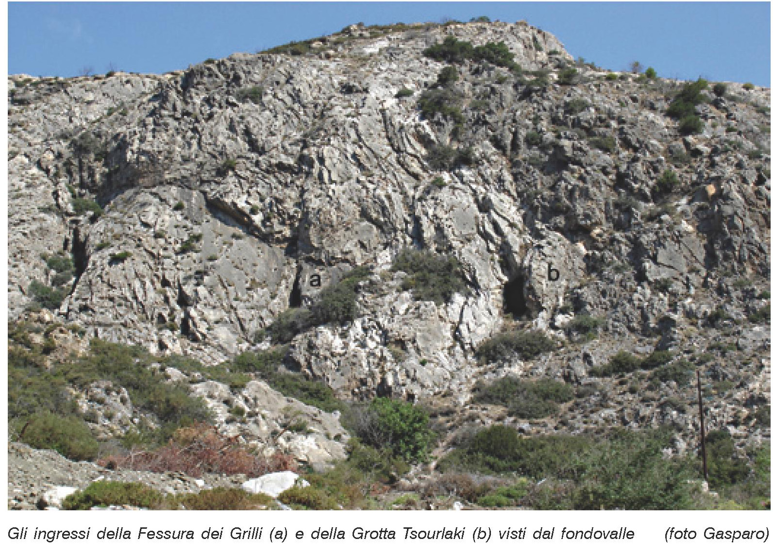 A una ventina di metri dall’ingresso della Grotta Tsourlaki – e alla medesima quota – è ubicata la Fessura dei Grilli (Grillenspalte), costituita da una stretta spaccatura rettilinea di 35 metri di lunghezza, che termina in fessure impraticabili. Quest’ultima cavità è la località tipica dell’ortottero Discoptila kinzelbachi Harz, endemico di Karpathos.