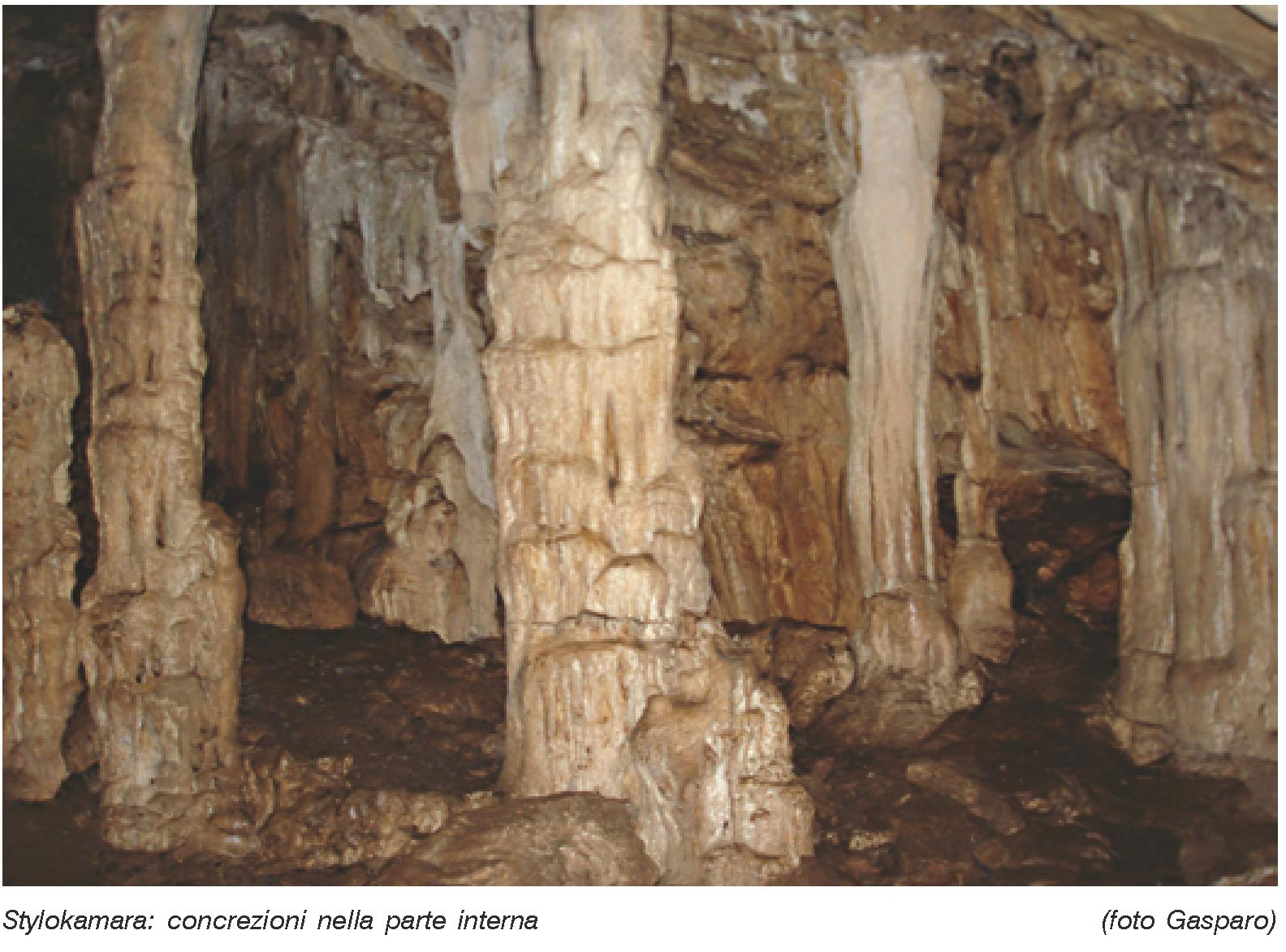 In posizione molto più isolata, al punto da essere conosciuta solo di nome dalla maggior parte dei locali, è la Stylokamara, che si apre a 255 metri di quota, in corrispondenza di una sella lungo la cresta delle aride colline sovrastanti la costa occidentale di Kassos. Si tratta di una galleria suborizzontale di una ventina di metri, concrezionata, alla quale si accede attraverso un ingresso piuttosto piccolo. Le indagini sulla fauna svolte nella parte più interna della grotta mi hanno consentito di raccogliere i ragni Hoplopholcus minous Senglet, Minotauria sp. (si tratta di esemplari giovani di una specie cieca, certamente nuova per la scienza, già rinvenuta in questa grotta e mai descritta per mancanza di individui adulti), Dysdera sp. (esemplari giovani di una specie epigea molto particolare, rinvenuta anche a Karpathos) e Tegenaria sp. (esemplari di sesso femminile di una specie cavernicola indeterminata, forse inedita) e i chilopodi Lithobius nigripalpis L. Koch e Cryptops trisulcatus Brölemann (det. Zapparoli). Come evidenziato nella premessa, la stazione presenta una fauna di notevole interesse, che comprende molti elementi endemici. Per questo motivo – unito al fatto che gli ambienti sotterranei, per dimensioni e bellezza delle concrezioni, non offrono certamente le meraviglie decantate dalla propaganda turistica – è auspicabile che le escursioni in questa piccola cavità siano limitate alle persone che vi si recano a fini di ricerca scientifica. Ciò non richiede necessariamente l’adozione di particolari interventi di tutela, ma può avvenire semplicemente attraverso una corretta informazione sull’interesse della grotta, volta ad evitare visite inutili, che potrebbero risultare particolarmente deleterie, soprattutto se effettuate da un numero di persone elevato o fornito di mezzi di illuminazione non adeguati.