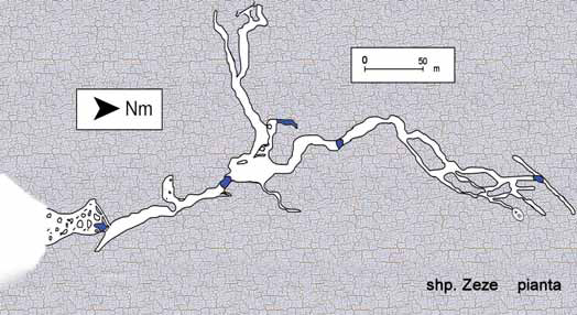 Di Shpella Zeze abbiamo esplorato e rilevato quasi un chilometro e mezzo di gallerie e la grotta continua in diversi punti. Il punto più interessante è un passaggio in prossimità del fondo attuale che nel 1993 era transitabile e consisteva in un saltino di tre metri che dava sopra un lago profondo, percorso da una fortissima corrente d’aria, che nell’ultima visita era ostruito da sabbia e ciottoli. Tutte e quattro le risorgive sono in corrispondenza di una evidente faglia NO – SE.