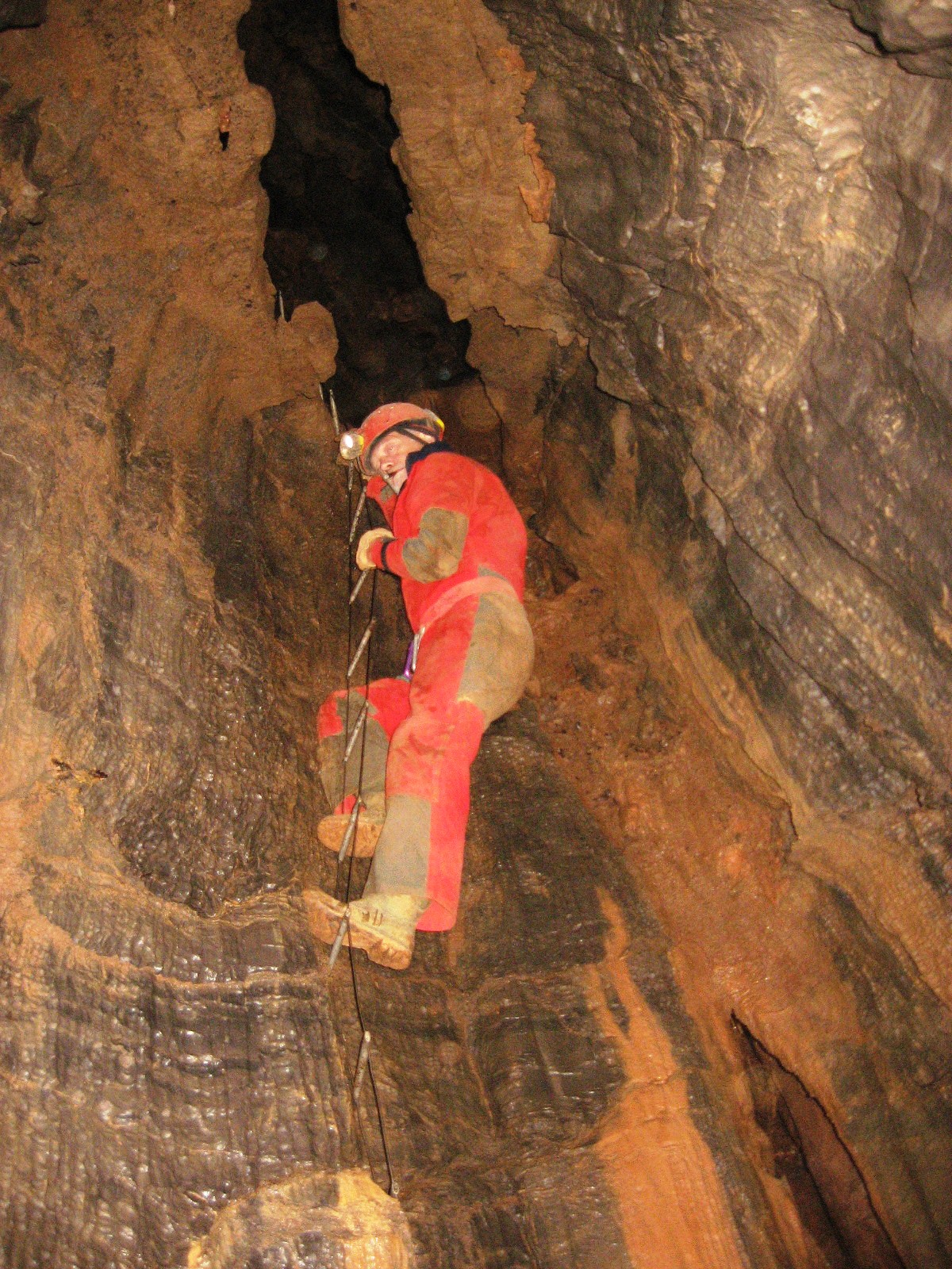 Alla base di questo stupendo pozzo, perfettamente levigato e privo di cumulo detritico, la progressione era data da una sequenza di meandrini e pozzetti con notevole attività idrica, che terminava su un’altra strettoia lunga circa tre metri oltre la quale echeggiava un altro pozzo di grandi dimensioni e con forte ruscellamento. Un veloce lavoro di allargamento permise la discesa di questo pozzo che dopo un altro salto di quattro metri portava ad una strettoia da dove giungeva il flusso dell’aria e dove l’acqua scompariva in un vano sottostante.
