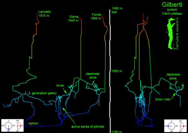 Riccardo Corazzi The Gilberti-system is located on the Canin plateau, in essence under the Rifugio Gilberti and the new ski-lift. It consist of three vertical caves, the Fonda, the Sisma and the Laricetto, explored by Italians cavers between 1984 and 2004.
