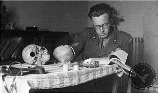 Ma si sa che lo speleologo difficilmente si distrae dalla sua meta, esplora anche quando è sottoufficiale di artiglieria, compie scavi archeologici nella Caverna dei Soldati (842 VG) presso Prosecco dove recupera un teschio sotto uno spesso strato di concrezione, reperto che consegnerà al prof. Raffa-ello Battaglia. Ciano sa farsi notare e la stima reciproca e conoscenza con il colonnello Italo Gariboldi, molto legato alla Commissione Grotte, fa si che gli vengano concesse licenze “speleologiche” che gli permetteranno di compiere esplorazioni sulle Murge ma soprattutto nel 1942 quando compie quella che risulterà la prima discesa nelle stufe di San Calogero a Sciacca in Sicilia, dove la Commissione poi continuerà e dove conduce ancora le ricerche. Discende il pozzo fino al Plateau Noir con scarponi e costume da bagno, accompagnato da Bruno Boegan, escono stremati all’esterno ed anche qui la documentazione fotografica testimonia la difficoltà dell’impresa.