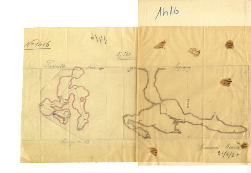 Devo dire che fa ancora il suo bel effetto emotivo trovarsi tra le mani il lucido originale di Gianni Cesca del rilievo della Golobina, nome della cavità indicata dai locali, così come non possono passare inosservati gli schizzi in matita prelevati direttamente sul campo, 21 aprile 1925, 85 anni fa….prosit! Il tutto oggi si trova nella nostra sede, conservato, protetto, forse protetto più che dallo scorrere degli inverni dalle confuse e puerili pretese di paternità dei documenti catastali, laddove l’ignoranza e l’idiozia di novelli nani ombrosi vanno a braccetto.