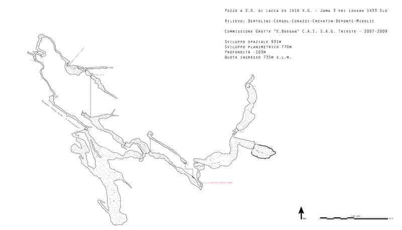 A fare un sunto oggi potremmo dire che per le dimensioni della cavità ci siamo forse un po’ troppo allungati nei tempi di esplorazione e rilievo, ma non sempre si riesce a trovare le giusta dimensione di uomini e motivazioni, anzi spesso questi due elementi non convergono. Ci siamo divertiti in ogni caso, che è la cosa più importante, abbiamo visto nuovi posti e nuova gente, mentre la gran parte dei nostri cittadini passava la domenica al centro commerciale o su Facebook. Come sempre siamo stati disillusi dalla cavità, una volta beccato il corso d’acqua sotterraneo che la percorre, eravamo veramente sicuri di aver trovato la formula giusta per fare una corsa all’ingiù nella Bainsizza, come insegnano gli abissi di Verco di Canale e il ponor Polne Lune. A tal riguardo, poche speranze abbiamo lasciato per strada per continuare il viaggio: a mio avviso solo due punti potrebbero essere indagati. Nella zona dello scivolo di 4m abbiamo tralasciato, lateralmente, due strettoie con aria pazzesca in uscita…ma che necessitano di pesanti lavori di scavo: si sospetta che un’altra cavità ancora sconosciuta possa arrivare li, un ingresso basso insomma. Ma è fantaspeleologia, se condita da tanto vino ci si può anche credere. Alla caverna terminale invece, preso il ramo che si diparte alla destra del punto più elevato della sala, prendendo ancora la diramazione di destra, si sbatte contro un arrivo in salita di esigue dimensioni ma non impossibile da aprire…la verità? Non avevamo più voglia. Butta acqua però il posto, e con piccoli lavori di apertura ci si potrebbe infilarsi e vedere. E buona fortuna.