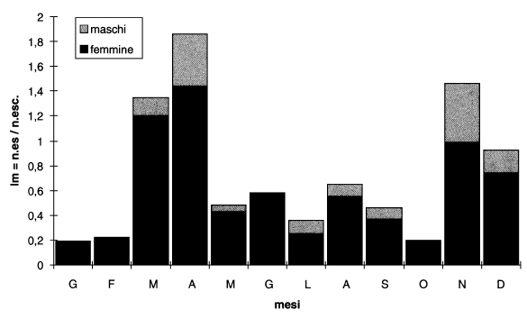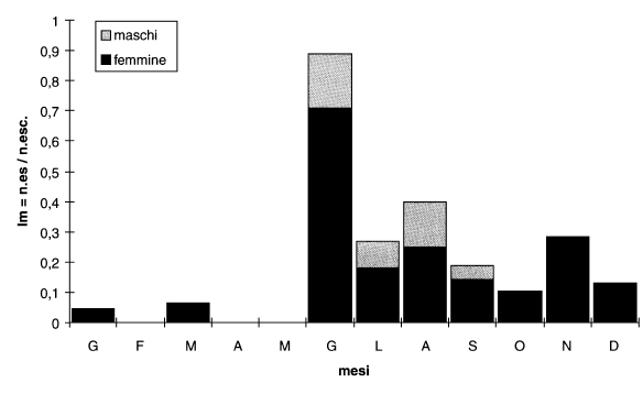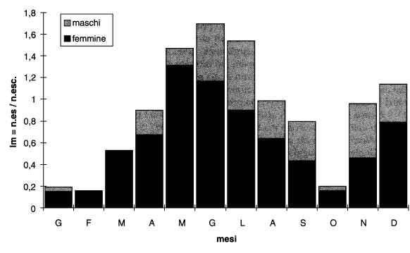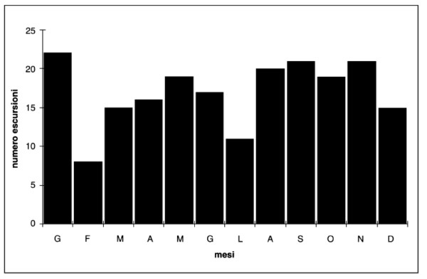 Le ricerche di campagna sono state curate da F. Gasparo, che ha raccolto la maggior parte del materiale, con la collaborazione di P. Guidi, C. Lang (Innsbruck), R. Prelli, G. Savi, M. e S. Tommasini, nel quadro delle attività della Commissione Grotte “Eugenio Boegan”. Le escursioni effettuate nel decennio sono complessivamente 204 e coprono tutto l’arco dell’anno, sia pur con frequenze diverse da mese a mese (fig. 2).