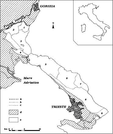 Fig. 1 – Carta dell’area in esame. Legenda, a: confine di stato; b: limite di provincia; e: limite di comune; d: terreni non carsificabili; e: rocce carbonatiche. Comuni di, 1: Savogna d’Isonzo; 2: Sagrado; 3: Doberdò del Lago; 4: Monfalcone; 5: Duino-Aurisina; 6: Sgonico; 7: Monrupino; 8: Trieste; 9: San Dorligo della Valle. Sono indicati solo i comuni in cui si aprono le 88 cavità indagate.