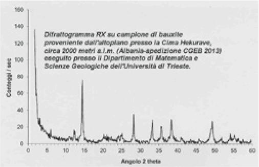 L’esame delle polveri omogeneizzate ricavate dal campione e sottoposte a difrattometria a raggi X rivelano un contenuto prevalente di boehmite (y-AIOOH) e subordinatamente di ematite (a-Fe2O3), che è l’ossido che conferisce alla roccia la colorazione rosso intenso. Alcuni picchi minori fanno intuire la probabile presenza di quantità minori di caolinite e di magnetite (Fe3O4). L’esame è stato eseguito da Davide Lenaz, del Dipartimento di Matematica e Geoscienze, a cui vanno i ringraziamenti miei e della CGEB.