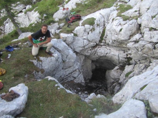 Le settimane son volate via in fretta ed è già giunto il momento di affrontar il caldo torrido dei primi agosto sui bianchi karren del Canin. Son di nuovo al bivacco DVP come l’anno scorso ma con me e con gli altri complessati si son aggiunti Marco Agri (no xe per lui) Alessio, Giulia e Dario freschi freschi di corso. Le mie ambizioni sono tante e il lavoro da svolgere è veramente molto visti i buoni risultati avuti l’anno scorso, ma per iniziare bisogna affrontare quell’argomento che pesa sempre a tutti: il disarmo. Alla mattina del 10 agosto assieme a Cavia, Agri, Paooolino, Alessio e Giulia scendiamo a casera Goriuda in Rotule Spezzate per disarmare e finire lo scavo di giunzione con Bus d’Aiar. Agri, dopo aver visto l’ingresso, si rifiuta di entrare ed io privo di imbrago non posso raggiungere gli altri al disarmo. Mi faccio coraggio e in solitaria affronto lo scavo, non combino molto, solo un metro. Esco ed Agri non c’è più e aspetto gli altri in casera; nella notte, man mano che il tempo passa aumenta la mia preoccupazione e giunta mattina la mia ansia mi porta a vestirmi e andare a vedere. (Li ho mandati io e solo Cavia si ricordava a stento la via. Nella notte l’incubo che mi assillava era l’immagine di Cavia in cima alla risalita del 136 rimasto senza corda per scendere in doppia e gli altri persi nei labirinti di Rotule a cercar l’uscita). Per fortuna una volta entrato li trovo sotto la prima risalita, estremo punto per me raggiungibile senza imbrago. Arrivati nella saletta prima dell’uscita i sacchi sono il doppio di noi presenti e, chi con 2 chi con 3, affrontiamo lo stretto bigolo dell’illusione (30 m di condottina dimensione uomo). Giulia viene graziata dal supplizio, essendoselo meritato in questa sua nuova impresa. Finita la tortura non resta che risalir con tutto il materiale verso il DVP. Arrivati nella conca del Meandro de Plucia troviamo John e Aldo venutici incontro con cibo, acqua e birra (che non manchi mai), un bel lavoro di gruppo. Abbandoniamo un po’ più su tutto il materiale speleo e, scarichi e leggeri, raggiungiamo il DVP: non ci resta che continuar la mattinata rimediando alla nostra disidratazione. Nella giornata arrivano in molti e il bivacco diventa sempre più affollato generando una delle tante serate di festa. Tutto ciò ci mette fuori gioco fino alla mattina del 13 quando iniziamo i lavori nella Conca dei Camosci: Cavia, Alessio e Giulia scendono un nuovo ingresso sotto l’abisso F. Scabar (parzialmente esplorato l’anno scorso) che purtroppo rispetto all’ anno precedente risulterà ostruito 10 m più in basso da un grosso blocco di neve caduto dall’alto. Nel frattempo io, Aldo e Paoolino scendiamo il canale parallelo fino a raggiungere il buco soffiante individuato da Papo l’anno scorso, il Laško Pivo. Iniziamo lo scavo tra pietre, ghiaccio e il solito vento gelido ma, come spesso accade dopo diverse ore di lavoro, la grotta diventa più stretta del desiderato. Raggiunti dagli altri (e presto anche dal buio) risaliamo verso la nostra dimora. Il giorno successivo ritorniamo e continuiamo a farci spazio tra le pietre di fondo e le strette pareti di Laško Pivo. Dopo lunghe ore di gelido lavoro e grazie anche all’esile fisico di Paoolino si riesce a forzar la strettoia. Purtroppo, come spesso accade, l’esplorazione termina ben presto: sembra che questa grotta sia proprio impenetrabile. Nei giorni successivi diamo un po’ di pausa a questo scavo troppo ossessivo, approfittando della cospicua presenza al DVP di soci e non, e preferiamo dissetar le nostre gole all’ombra del bivacco. Passato Ferragosto la tranquillità ritorna, il bivacco si svuota da tutti i ferraioli e riprendiamo lo svolgimento della normale attività. Cavia assieme a Dario e Vicky vanno in Dobra Pička a recuperare materiale, mentre io e Paoolino ritorniamo in Laško Pivo e questa volta dopo le solite svariate ore di implorazioni multiformi si riesce a forzare la strettoia che si allarga passo dopo passo fino alla partenza del pozzo sperato; finalmente un buon risultato (chi la dura la vince). Intanto arrivano al DVP Paolo e Seba e assieme a loro il giorno successivo scendiamo in Laško Pivo ove un paio di pozzi e larghissimi meandri ci fanno raggiungere la quota -40 in cui un meandro-frattura (Meandro Laško Pavo) blocca dopo una trentina di metri la nostra esplorazione. Con un po’ d’amaro in bocca usciamo con il rilievo di rito e non ci resta che accantonarlo e proceder con le esplorazioni nell’abisso Fabio Scabar.
