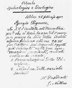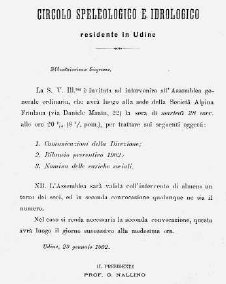 Il professore e cavaliere Giovanni Nallino, viene eletto a secondo presidente del Circolo Speleologico e Idrologico Friulano nell’assemblea generale del 30 dicembre 1899 ottene