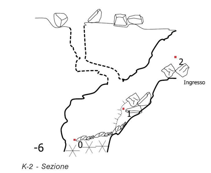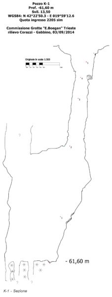 K-1 | 42°22’50.34″N 19°59’12.62″E | 2205 slm | 2013, Riavini 03/09/2014 Corazzi-Gabbino | Pozzo verticale di 60m con possibile prosecuzione al fondo (tappo nivale), da rivedere. |