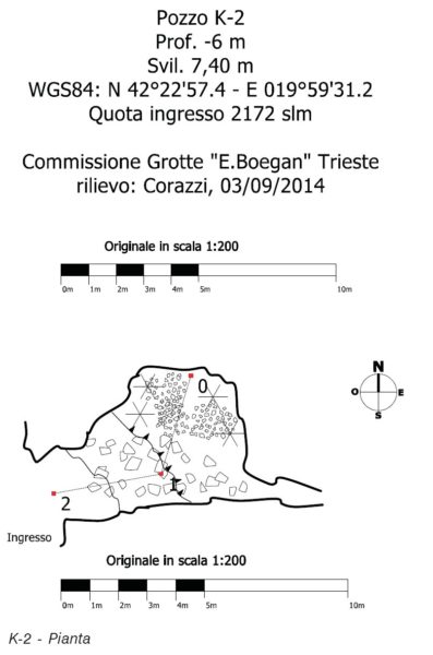 K-5 | 42°22’53.12″N 19°59’39.84″E | 2201 slm | 04/09/2014 Corazzi-Gabbino | Cavità alpina in explo, a -75m si apre un pozzo non sceso stimato 50m |