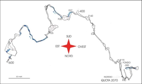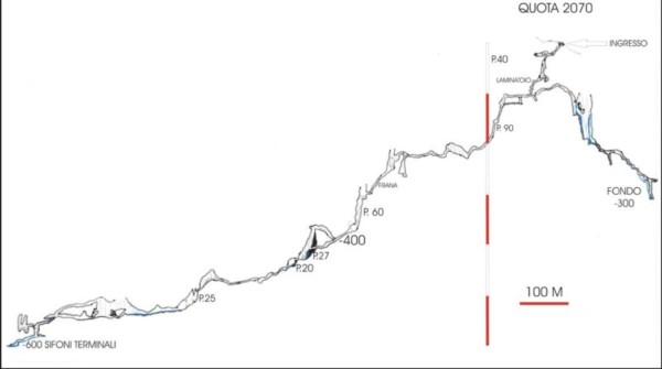 Scendendo la china detritica nella sala in direzione NE un passaggio in frana (arrampicata discendente) conduce ad un P.30 (corda). Qui entriamo nel lungo (300 m) cañon (direzione Sud) che sia d’estate che d’inverno con regimi idrici minimi viene attraversato da un fragoroso torrente. Verso la fine del meandro due frane obbligano a contorsionismi per esser oltrepassate e mentre la prima con un’arrampicata di cinquanta metri conduce al Salone Leo – dove proseguono le esplorazioni – la seconda porta ad una galleria dalle dimensioni di metri 10 x 10 che si interna in direzione Est. Questo ultimo tratto con il pavimento costituito da fanghi nerastri presenta evidenti i segni del livello delle piene che arrivano al soffitto allagando la grotta per centinaia di metri. Al termine della galleria, quota –556, un esiguo passaggio conduce ad un P.20 e dopo uno stretto meandrino e successivo P.10 si giunge ai sifoni terminali (fondo attuale). Questo tratto non è stato rilevato ma la quota stimata è –600. Dal salone Leo, trovato ultimamente seguendo i flussi d’aria, due gallerie contrapposte conducono a nuove zone ancora in fase di esplorazione. Lo sviluppo attuale è di oltre i due chilometri rilevati e due fondi, a –300 e –600.