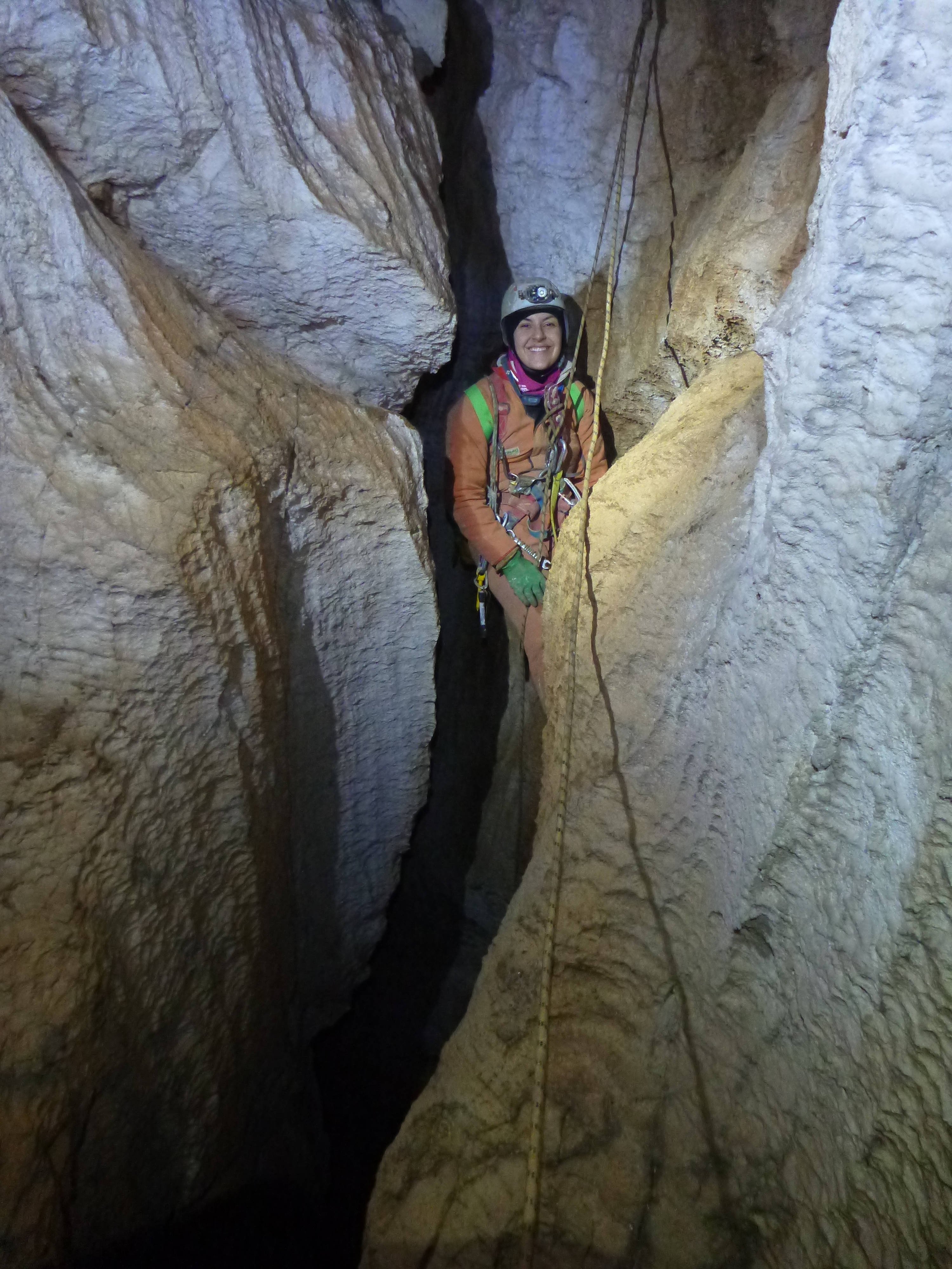 Dopo il primo tiro da quaranta metri, ci siamo fermati su un terrazzo, dove confluiscono dei meandri che vanno a stringersi fino ad essere impercorribili. E poi dopo altri venti metri di arrampicata siamo arrivati in una sala di crollo che non sembra avere ulteriori prosecuzioni se non verso l’alto, dove ulteriori 20m ci separano dal punto più alto del camino, ma avevamo finito la corda e dopo aver dato un’occhiata intorno senza aver individuato nulla di particolarmente interessante siamo ridiscesi dai nostri amici che ci stavano aspettando infreddoliti nelle condotte. Il camino è rimasto attrezzato, e per il momento non ci siamo più ritornati anche se deve essere ancora rilevato e riguardato meglio alla base, dove probabilmente qualche strettoia ci è sfuggita, come pure gran parte dell’aria. Ritorneremo perché la giunzione è proprio li vicina…