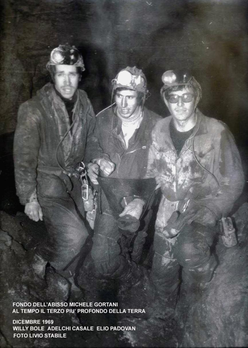 Dal giorno 22 dicembre 1969 al 5 gennaio 1970 si svolge la seconda spedizione invernale all’Abisso Michele Gortani. Sono previste due squadre che opereranno a quote diverse. La prima, composta da me, Elio Padovan, Livio Stabile e Willy Bole, scende in grotta il 22 Dicembre. La seconda squadra, composta da Mario Pivileg-gi, Fulvio Gasparo e Dario Bassi, scende pochi giorni dopo e si attesta al campo base di -450 metri. I vari campi sono collegati tra di loro telefonicamente in modo di poter comunicare durante le varie fasi dell’esplorazione. Noi della squadra avanzata decidiamo di piazzare un ulteriore campo, dopo quello posto a -540 metri, a quota -670 metri, situato alla base del pozzo alla fine della Galleria del Vento che si trova praticamente all’inizio del grande meandro finale. Il posto non è dei migliori, copriamo quindi un angolo tra i grandi massi che occupano la caverna con dei teli termici uniti con nastro adesivo per evitare l’abbondante stillicidio. Iniziano qui i primi problemi.