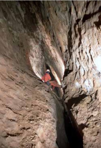 Sono state intensificate ricerche esplorative in corrispondenza della “Caverna Finocchiaro”, il maggior vano della Grotta Impossibile. Dal punto di vista geomorfologico questa caverna (lunga 130 m, larga 60 m e con un’altezza di circa 70 m) risulterebbe in realtà suddivisa (in passato) in due cavità di cui rimane un “esile” relitto di diaframma di roccia aggettante dalla parete posta a nord (Visintin, 2010). Nel 2021, con una arrampicata di circa venti metri si è raggiunta una nuova galleria (precedentemente ipotizzata), situata sulla parete sud della caverna (Fig. 10), che è stata esplorata per una cinquantina di metri fino a un’ostruzione. Attualmente, si valuta se liberare il passaggio ostruito. Questa scoperta si è rivelata importante giacché consente una migliore ricostruzione dell’evoluzione del sistema di gallerie e, in particolare, della stessa “Caverna Finocchiaro” che risulta essere stata, con chiarezza, un “nodo” plurilivello di gallerie guidato da faglie e fratture importanti.